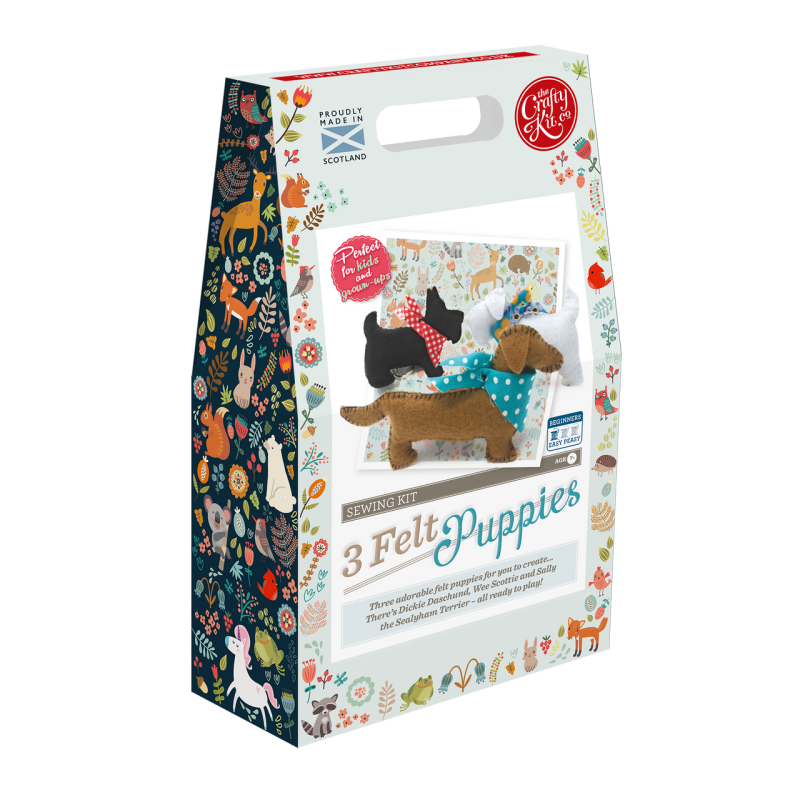 Il kit di artigianato della Crafty Kit Company contiene tutto il necessario per realizzare 3 splendidi cagnolini, oltre ai componenti per trasformarli in un portachiavi e 2 spille.