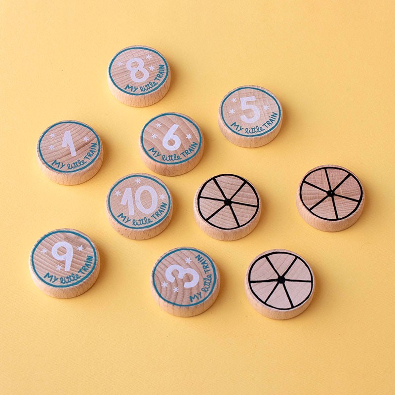 Con le monetine in legno numerate, il bambino con l'aiuto di un adulto, può contare i passeggeri e indicare quanti orsi, conigli, maialini, lupi o pinguini viaggiano su ogni vagone.